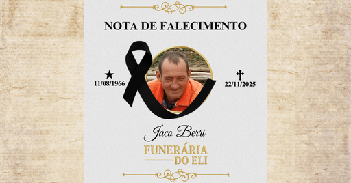 A Funerária do Eli de Rio do Campo comunicou o falecimento de Jaco Berri, ocorrido neste sábado, dia 22 de novembro de 2025, aos 59 anos. A família divulgou nota informando o pesar pela perda, estendida a parentes, amigos e à comunidade.