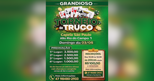 Os amantes do carteado já podem se preparar para um grande evento de confraternização e disputas acirradas na nossa região. A Capela São Paulo, localizada na comunidade de Alto Rio do Campo 1, no município de Rio do Campo, vai promover um Grandioso Torneio de Truco no domingo, dia 3 de maio.