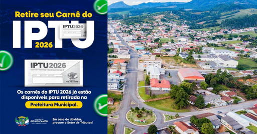 Os contribuintes de Rio do Campo já podem se organizar para o pagamento dos impostos municipais deste ano. Os carnês do Imposto Predial e Territorial Urbano (IPTU) de 2026 já estão disponíveis para retirada na Prefeitura Municipal de Rio do Campo.