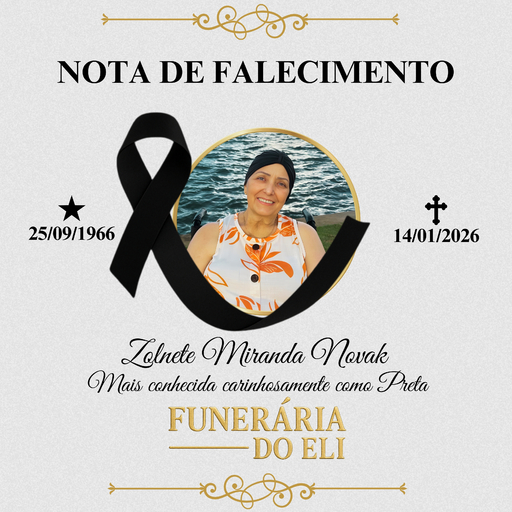 A Funerária do Eli, de Rio do Campo, juntamente com o esposo José Novak e as filhas Camila e Carin, moradores de Alto Rio Azul, comunicam com profundo pesar o falecimento de Zolnete Miranda Novak, carinhosamente conhecida como Preta, ocorrido nesta quarta-feira, 14 de janeiro de 2026, aos 59 anos de idade.
