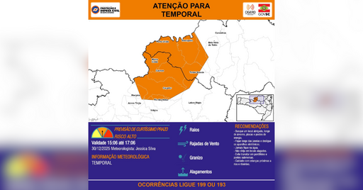 Segundo a Defesa Civil, o cenário indica risco elevado para alagamentos em áreas urbanas, quedas de galhos e árvores, destelhamentos e danos estruturais causados pelas rajadas de vento e pela eventual queda de granizo.