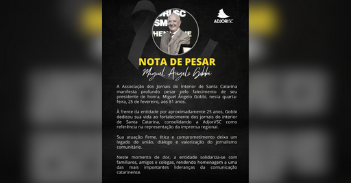 A comunicação de Santa Catarina despede-se hoje de um de seus maiores pilares e exemplos. A Associação dos Jornais do Interior de Santa Catarina (ADJORI/SC) manifestou profundo pesar pelo falecimento de seu presidente de honra, Miguel Ângelo Gobbi, ocorrido nesta quarta-feira dia 25 de fevereiro aos 81 anos.